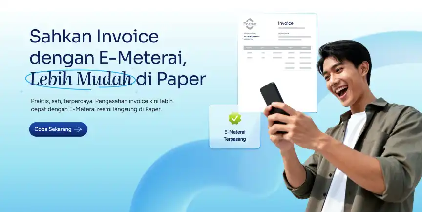 Sesuai Undang-Undang Bea Meterai No. 10 Tahun 2020 Pasal 3 Ayat (2), setiap transaksi di atas Rp5.000.000, wajib menggunakan E-Meterai. Paper menyediakan E-Meterai resmi dari PERURI untuk pengesahan invoice penjualan.
